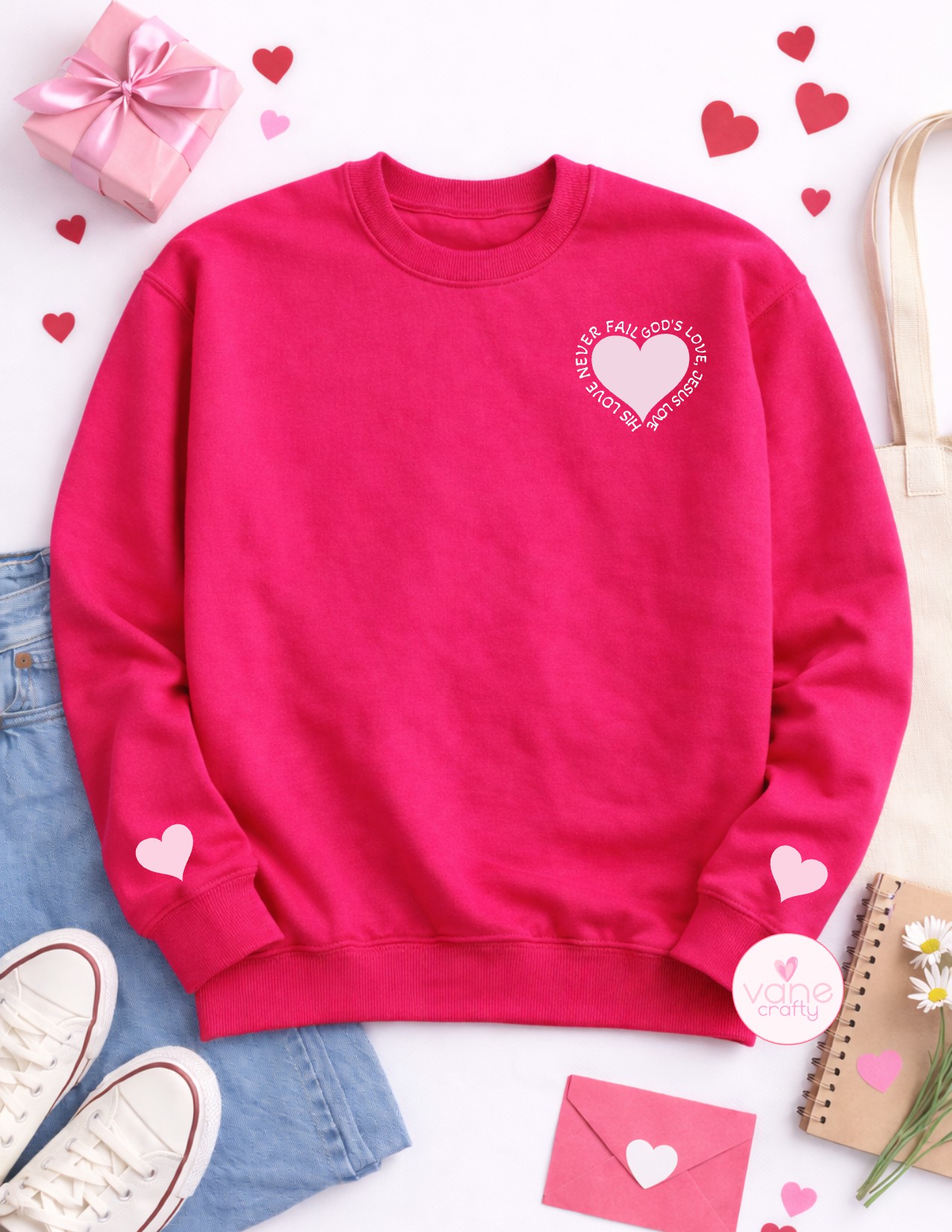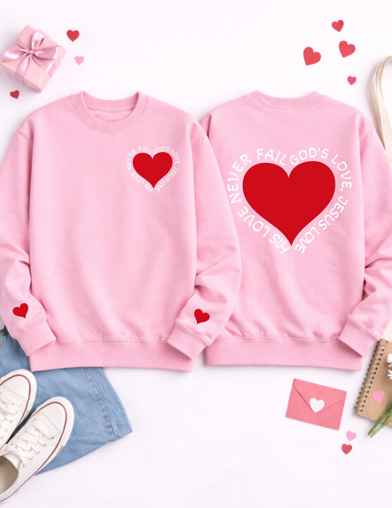 Faith-inspired Christian sweatshirt featuring “His Love Never Fails – God’s Love.” Perfect for Valentine’s Day, church, gifts, and everyday wear. Soft, cozy, and meaningful.