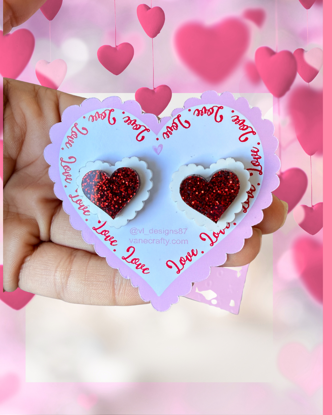 Red glitter/White Valentine Heart Earring Studs